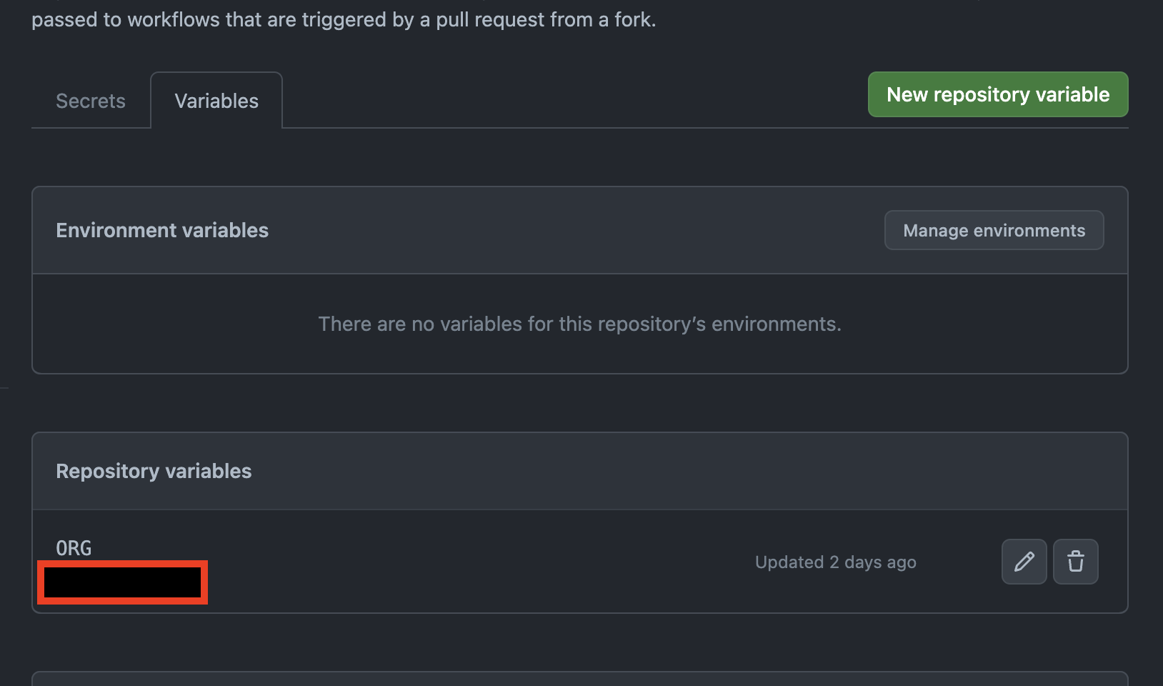 Variables > Repository variable > New repository variableから空席数を確認するOrganizationを登録します。