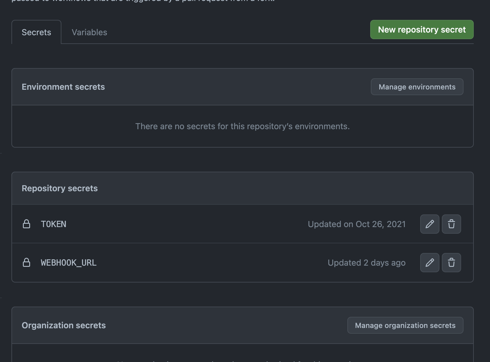 Secrets > Repository secrets > New repository secretからトークンSlackのWebhook URLを登録します。