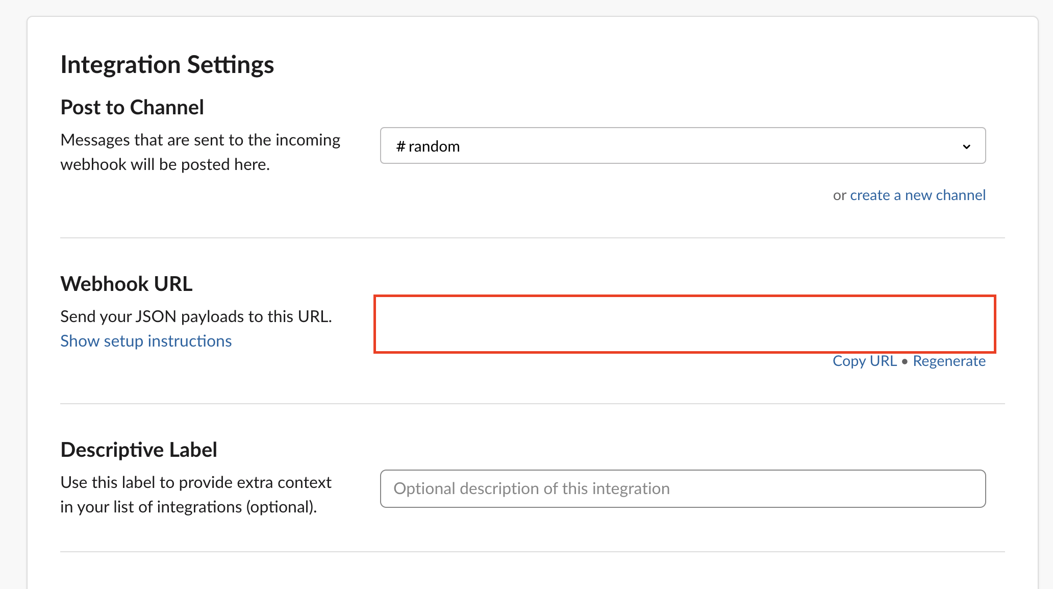 Incoming Webhooksの設定です。Webhook URLは後ほど利用します。