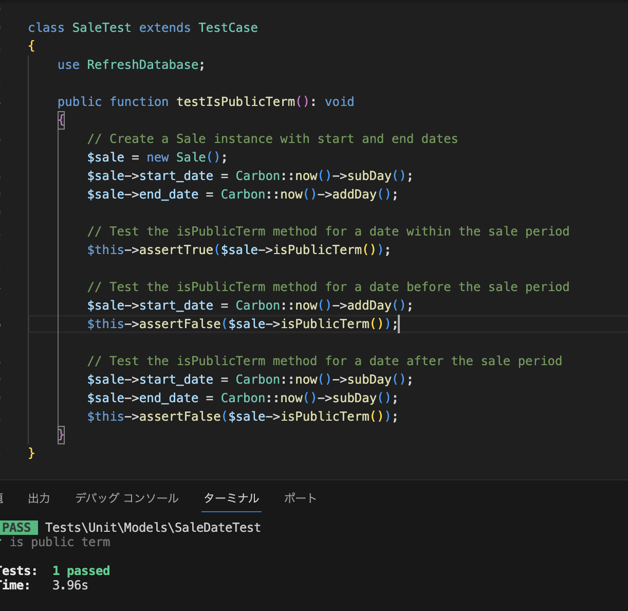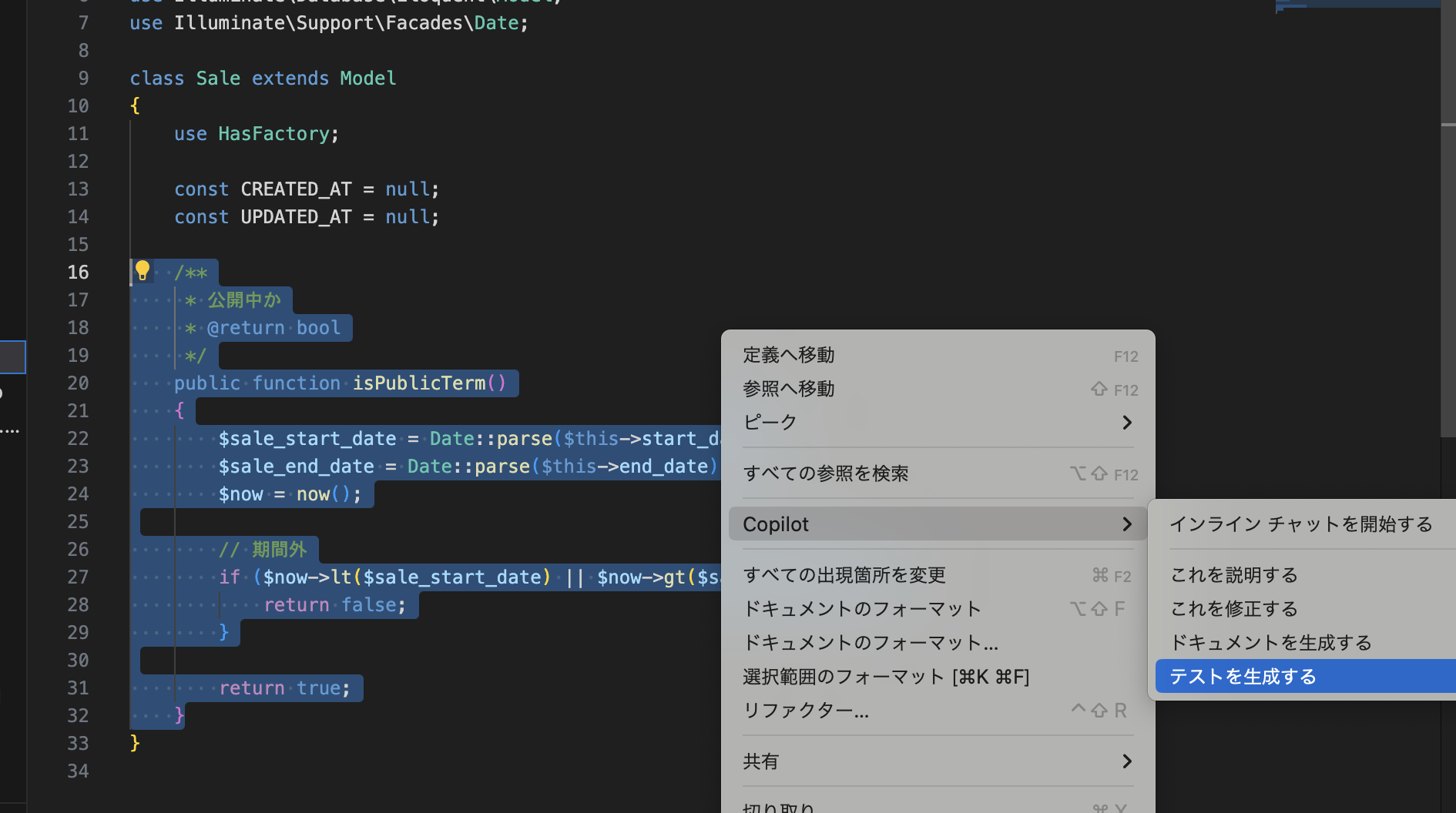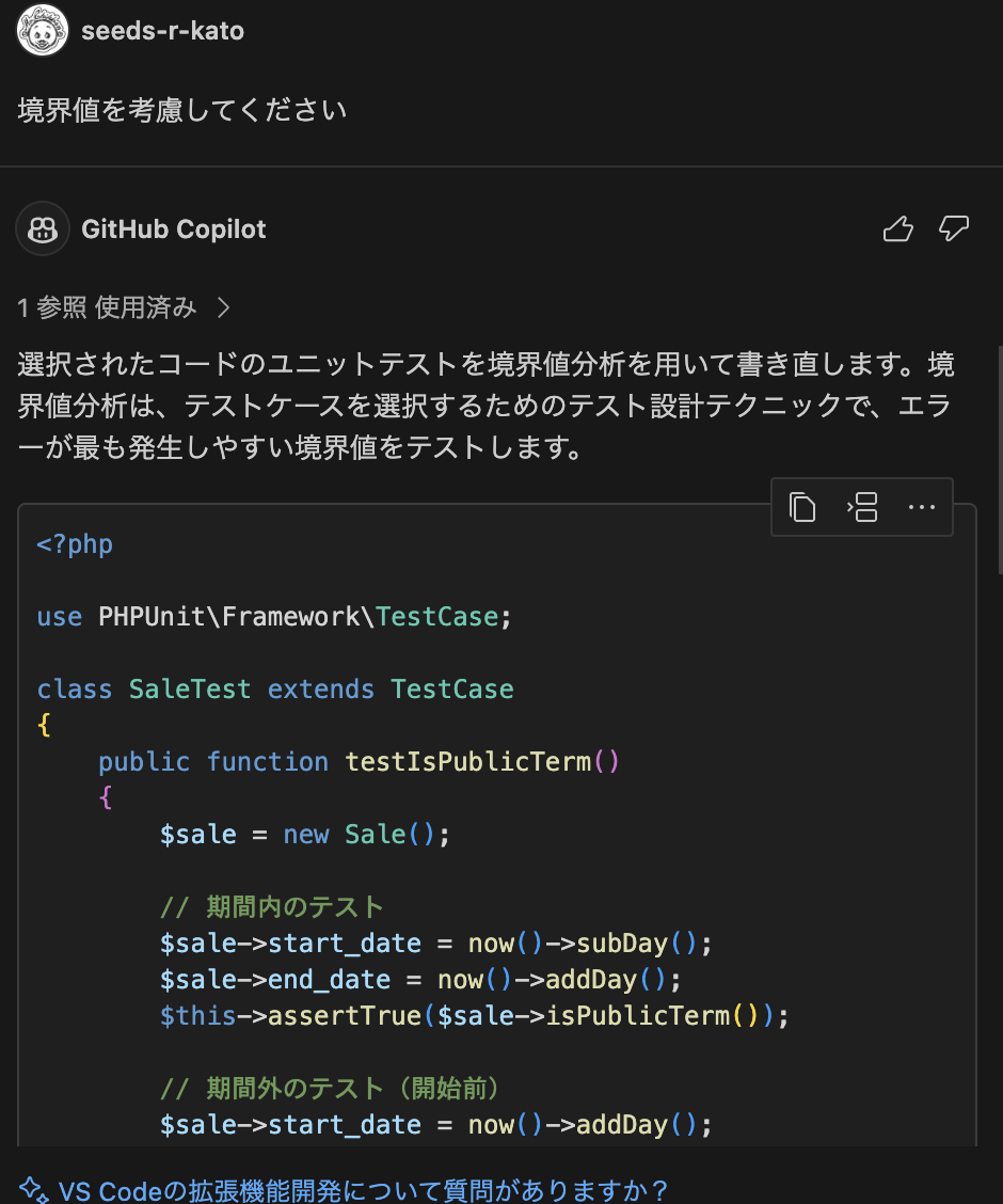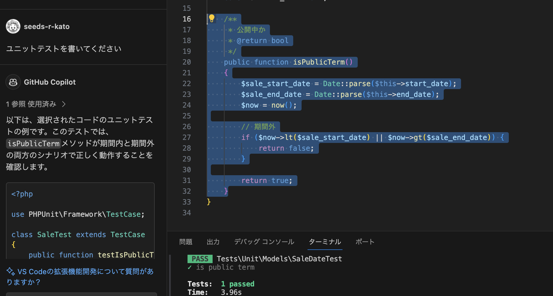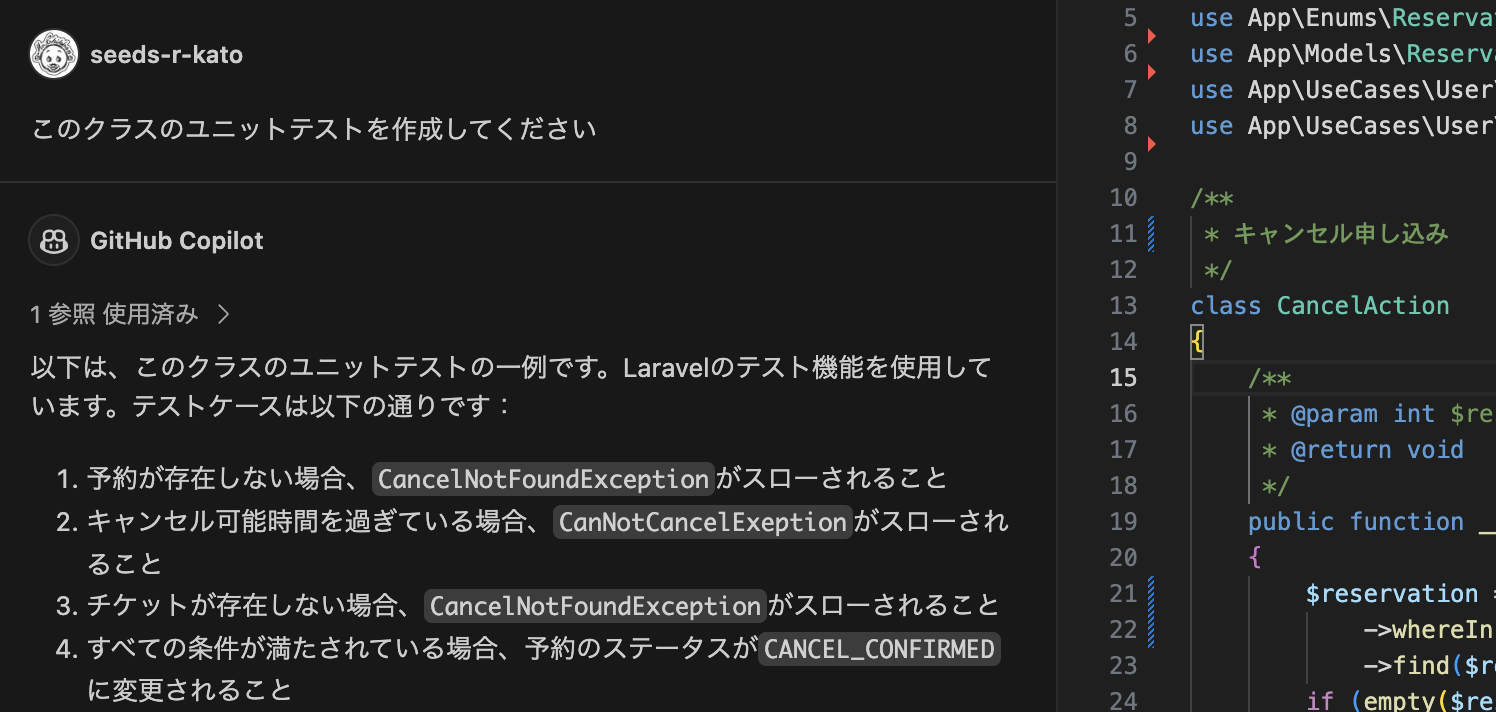Github Copilot Chat で PHP(Laravel) の Unit テストの作成を試してみました。